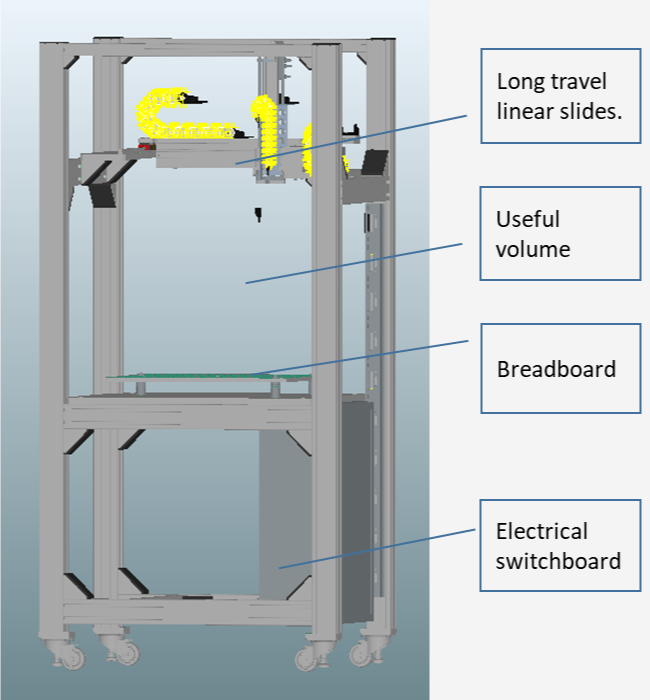 The backbone of the end station is a movable frame made of aluminium profiles, equipped with three independent, motorised and programmable long travel linear slides. The linear slides can be used to position and/or continuously move the samples or detectors. The maximal travelling length is 300mm in each directions. The linear slides are located at the very top of the end station, so the samples or detectors can be suspended from above in the useable space designated to the experiment.
